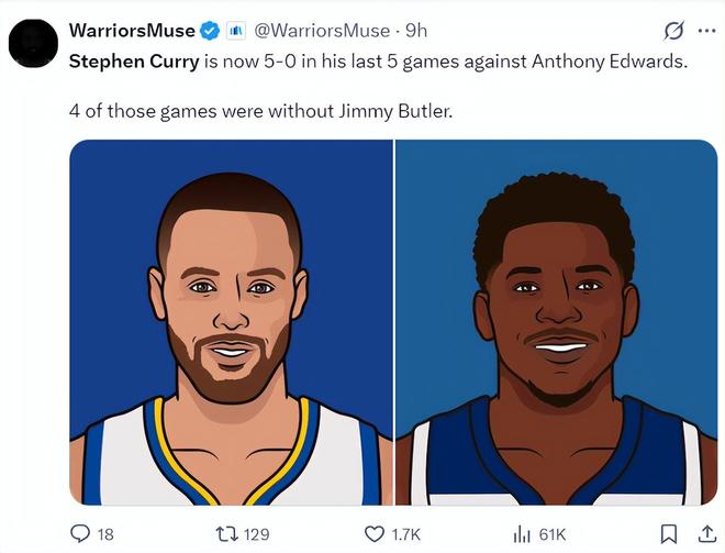 這場比賽后,庫里最近五次面對(duì)愛德華茲都取得了勝利,而且這5場勝利中有4場都沒有吉米-巴特勒,這說明庫里成為愛德華茲的一個(gè)夢魘。