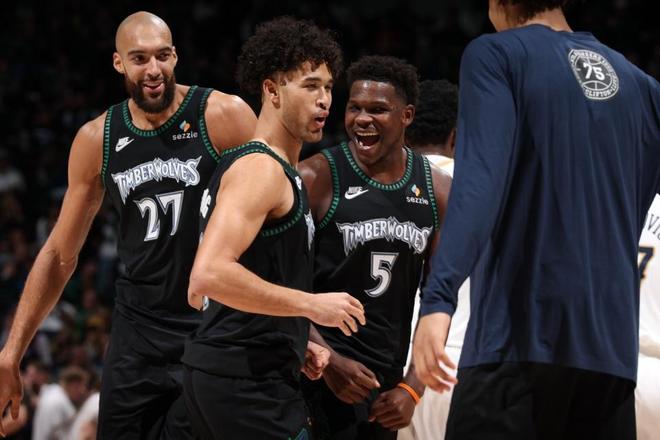 森林狼:戈貝爾、蘭德?tīng)?、麥克丹尼爾斯、迪文琴佐、?ài)德華茲