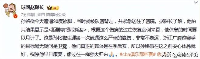 根據(jù)媒體人趙探長的報(bào)道,孫銘徽今天遭遇90度崴腳,當(dāng)時(shí)就被隊(duì)醫(yī)背走,并緊急送往了醫(yī)院。據(jù)探長了解,他拍片結(jié)果顯示是<距腓前韌帶撕裂>,根據(jù)這個(gè)傷病的過往恢復(fù)案例來看,他休息的時(shí)間要以月計(jì)了。