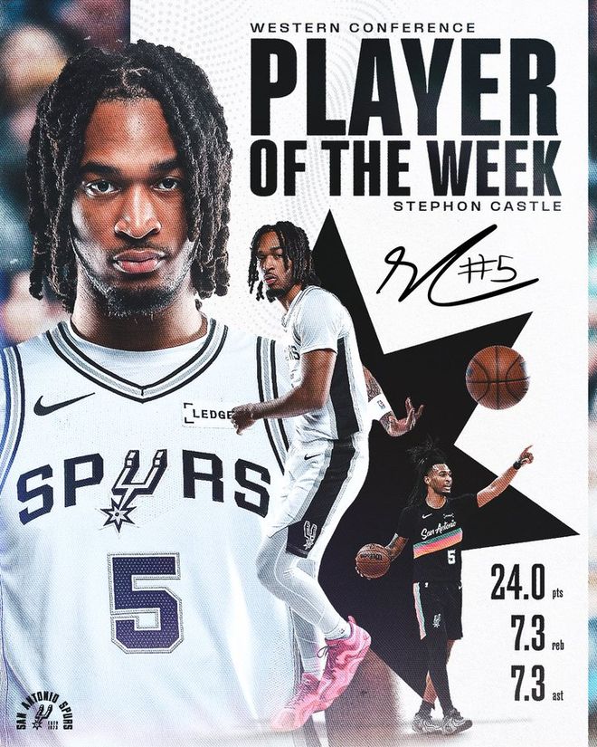 過去一周,卡斯爾場均24分7.3籃板7.3助攻3.0搶斷,投籃命中率63%,幫助馬刺拿下3勝0負的戰(zhàn)績。