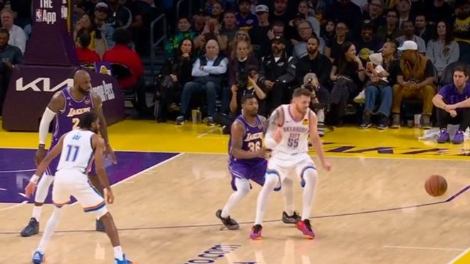 第四節(jié)決戰(zhàn),哈滕空切接球上籃造成范德比爾特犯規(guī),湖人挑戰(zhàn)成功改湖人球權(quán)??斔髁P球時(shí)哈滕和艾頓同時(shí)提前進(jìn)線,裁判又吹罰中圈跳球。斯瑪特身后捅掉哈滕接球出界,裁判給到雷霆球權(quán),湖人接著挑戰(zhàn)再成功,裁判太搶戲了,這是真是主場?華萊士前場搶斷后助攻杰威打進(jìn),回放顯示華萊士疑似先出界,湖人又吃虧,切特?fù)屜虑皥霭灞┛鄣檬?,雷霆還剩1分鐘領(lǐng)先湖人5分,最終,湖人110-109無緣逆轉(zhuǎn),慘遭雷霆雙殺。
