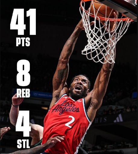 上場打森林狼,倫納德打了34分鐘(首發(fā)出場時間最久),30投14中,全場狂轟41分8板。