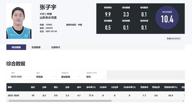 目前張子宇在WCBA場均8.5分鐘,拿到9.9分3.3籃板0.1助攻0.1搶斷0.5蓋帽,命中率77.4%,雖然登場時間少但效率值非常之高,18歲已經(jīng)2.26米的張子宇就是女籃的核武。