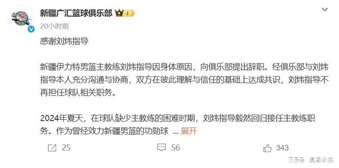 昨天新疆隊(duì)正式官宣劉煒指導(dǎo)離隊(duì),并且感謝劉煒指導(dǎo)這兩年在新疆隊(duì)的復(fù)出,祝愿他未來的生活和工作一切順利。其實(shí)劉煒指導(dǎo)早在一個(gè)月前就已經(jīng)卸任了新疆隊(duì)主教練的職務(wù),只是他還在新疆隊(duì)擔(dān)任其他的職務(wù),并沒有離開新疆隊(duì)的教練組,這次官宣應(yīng)該是劉煒指導(dǎo)和新疆隊(duì)正式告別,春節(jié)后他可能會(huì)加入其他的球隊(duì)重新開始。