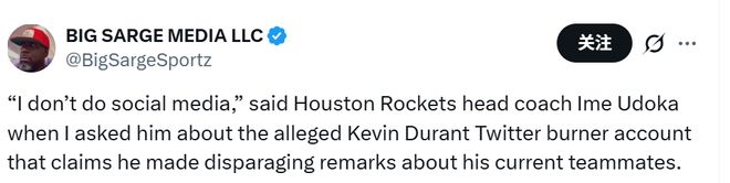 火箭主帥烏度卡被問及此事,回應道:“我不玩社交媒體。”