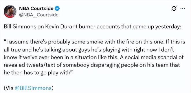名嘴比爾-西蒙斯也在播客節(jié)目上談到了近期爆出的杜蘭特小號(hào)事件:“我覺(jué)得這事無(wú)風(fēng)不起浪。如果全是真的,而且他在吐槽現(xiàn)在還在并肩打球的隊(duì)友,那我們可能從沒(méi)見(jiàn)過(guò)這種局面 —— 社交媒體丑聞曝光,實(shí)錘他在貶低自己的隊(duì)友,轉(zhuǎn)頭還得跟他們一起打球?!?/p>