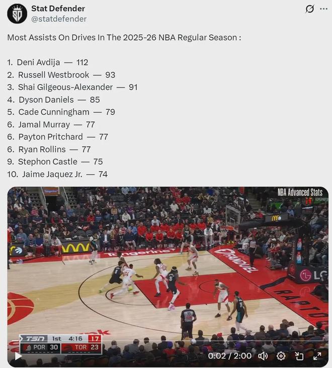 威少的合同是1年360萬美元底薪,打著打著成了國王兩大核心之一。威少有一項數(shù)據(jù)排名聯(lián)盟前列,本賽季突破后的助攻次數(shù)(截至2月18日):威少93次排名聯(lián)盟第二,阿夫迪亞112次位列聯(lián)盟第一,亞歷山大91次排名聯(lián)盟第三。