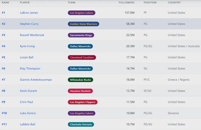 國王隊為了輸球,有時候收官階段故意換下威少和德羅贊。今天國王是真想贏球了,決勝階段依然把他倆留在場上。近日有媒體盤點了足球、籃球和橄欖球的球星Ins粉絲數(shù),威少2250萬粉絲排名NBA第三,僅次于詹姆斯和庫里。