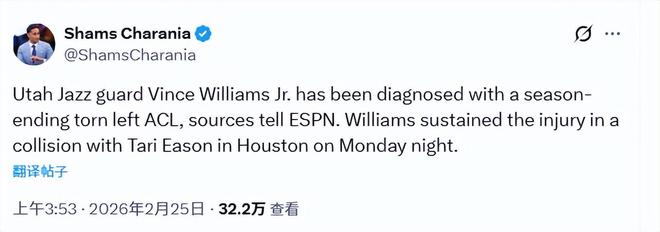 北京時間2月25日,據(jù)名記Shams報道,在接受進一步檢查后,爵士球員小文斯-威廉姆斯確診為左膝前交叉韌帶(ACL)撕裂。這一傷勢不僅讓威廉姆斯直接報銷2025?26賽季,按照這類傷病的常規(guī)恢復周期,他2026?27賽季的大部分時間也很可能無法出戰(zhàn)。