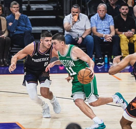 次節(jié)比賽,雙方連續(xù)兩節(jié)單節(jié)不足30分,凱爾特人逐步以28-38落后,并在之后以30-41落后11分差距。懷特第二節(jié)爆發(fā)出戰(zhàn)9分鐘,7中5單節(jié)得到13分,引領(lǐng)凱爾特人打出一波12-0攻勢(shì)反超比分,凱爾特人單節(jié)打出29-20攻勢(shì)凈勝9分,上半場(chǎng)結(jié)束凱爾特人50-46反超太陽(yáng)。