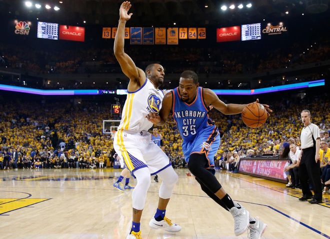 首先,我們先來談?wù)劧磐俚谋憩F(xiàn),雷霆隊能夠在前四場取得絕對的領(lǐng)先優(yōu)勢,靠的就是二人的頂級發(fā)揮。在這4場比賽中,杜蘭特場均可以貢獻31.8分、7.5個籃板和3.3次助攻,投籃和三分命中率分別達到了50%和42.1%,在進攻端完全就是Bug級別的存在,史蒂夫·科爾無論如何進行排兵布陣,都無法阻擋杜蘭特的投射,造成了勇士隊的防線大崩盤。