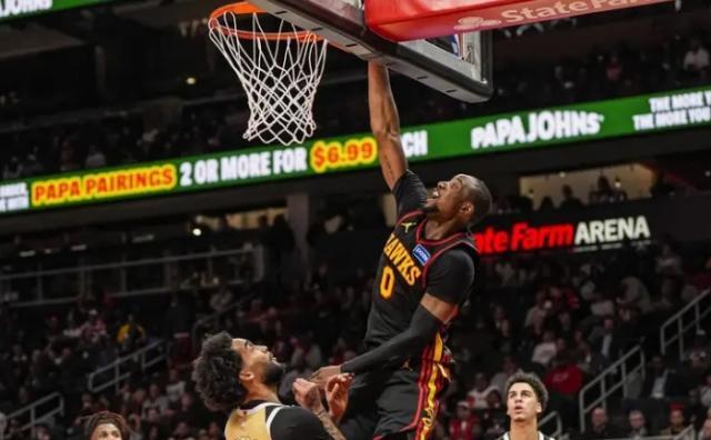 雖然說(shuō)這是一場(chǎng)多達(dá)21分的大勝,但對(duì)于庫(kù)明加而言,此役絕非傳統(tǒng)意義上的順風(fēng)球。本場(chǎng)比賽,老鷹絕對(duì)核心杰倫·約翰遜因?yàn)轶y部傷病只打了不到6分鐘便退出比賽,老鷹隊(duì)鋒線失去了最重要的破局者。這是球隊(duì)的臨場(chǎng)危機(jī),卻也是庫(kù)明加的最好機(jī)會(huì)。走上球場(chǎng),快攻終結(jié)、近筐強(qiáng)打以及三分球投射,庫(kù)明加展現(xiàn)出了自己全面的進(jìn)攻技巧。在科爾眼中無(wú)法與勇士體系適配,無(wú)限遭到棄用的他,在亞特蘭大的夜空中振翅翱翔。