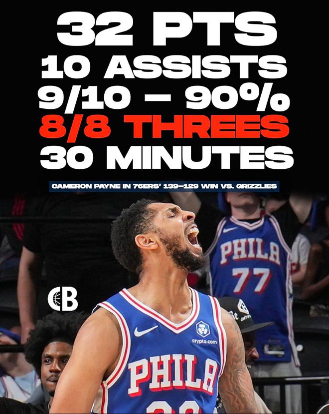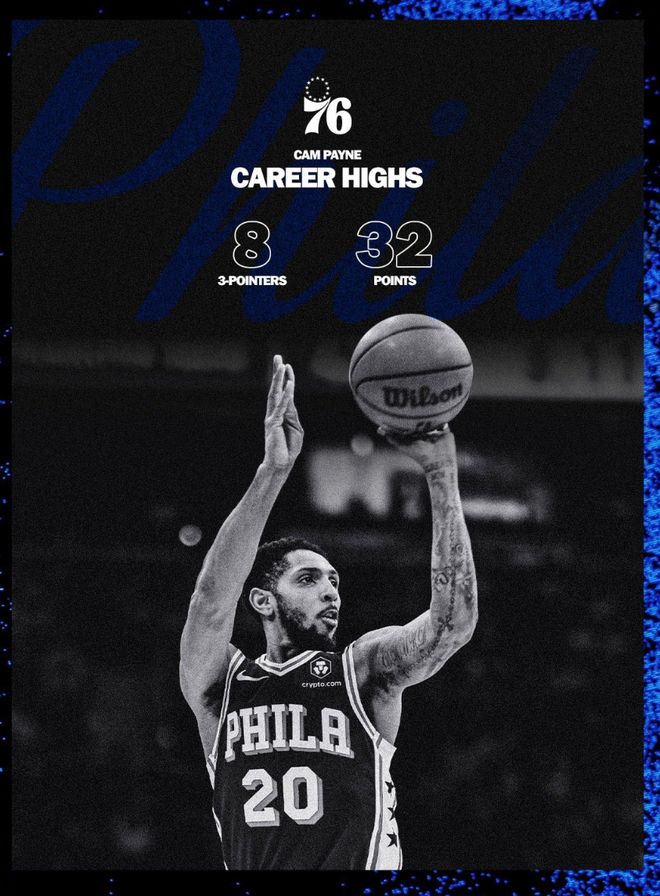 4.他是費城隊史首位替補30+10+8三分(三分8中8)的首人;
