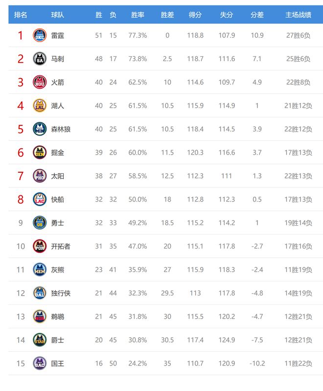 今日比賽后火箭、湖人、森林狼排名互換,其他西部球隊(duì)排名不變。