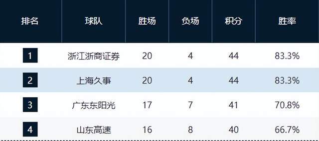 廣廈20勝4負(fù)穩(wěn)居榜首,主場33分血洗同曦,統(tǒng)治力依舊;上海同為20勝4負(fù),因凈勝分劣勢屈居第二,雙雄領(lǐng)跑,身后追兵已無望。