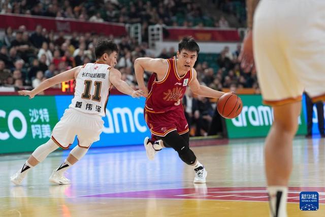 3月11日,吉林長白山恩都里隊球員姜偉澤(左)和山西汾酒隊球員于米提在比賽中爭搶。新華社記者 楊晨光 攝