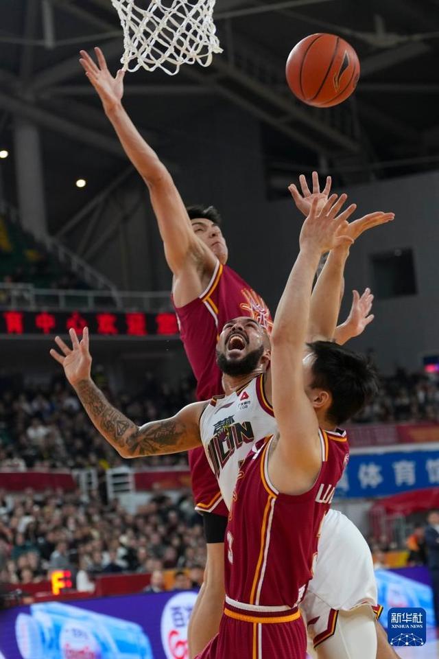 3月11日,吉林長白山恩都里隊球員摩爾(中)在山西汾酒隊球員于米提(左)、賈明儒(右)的防守下上籃。新華社記者 楊晨光 攝