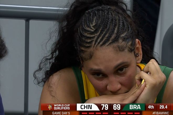 還剩一分多鐘,韓旭罰球建立兩位數(shù)領(lǐng)先優(yōu)勢(shì),基本宣告比賽的勝利??ǘ嗨饕呀?jīng)掩面哭泣,還用毛巾揮打鏡頭。最終中國女籃83比71擊敗對(duì)手。巴西隊(duì)揮淚告別本屆世界杯。