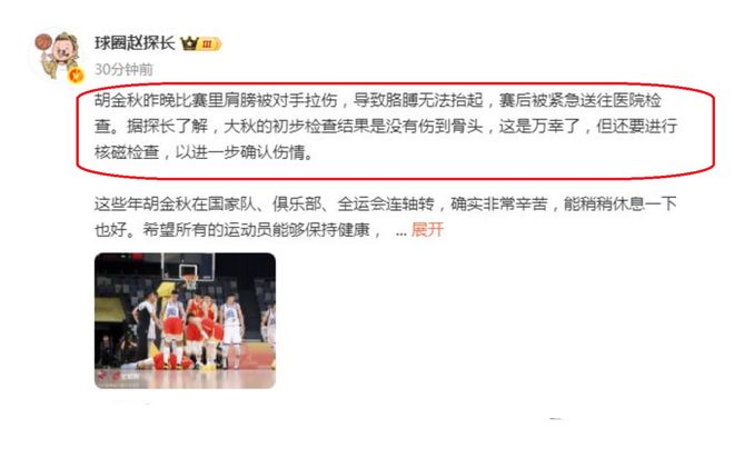 來(lái)到醫(yī)院之后,胡金秋馬上被安排進(jìn)行檢查,根據(jù)最新消息了解,從檢查結(jié)果來(lái)看,還是一個(gè)比較理想的結(jié)果,胡金秋此番受傷沒有傷到骨頭,可以說(shuō),這也是不幸中的萬(wàn)幸了。不過(guò),具體的情況,還要進(jìn)行一次核磁檢查,從而進(jìn)一步確認(rèn)胡金秋的傷情。
