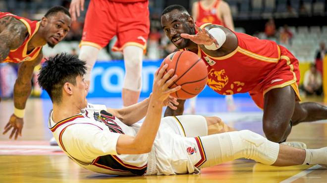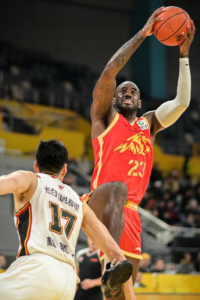 3月18日,吉林長白山恩都里隊(duì)球員欒利程(下)與浙江浙商證券隊(duì)球員賈卡爾·桑普森(右)拼搶。新華社記者 江漢 攝