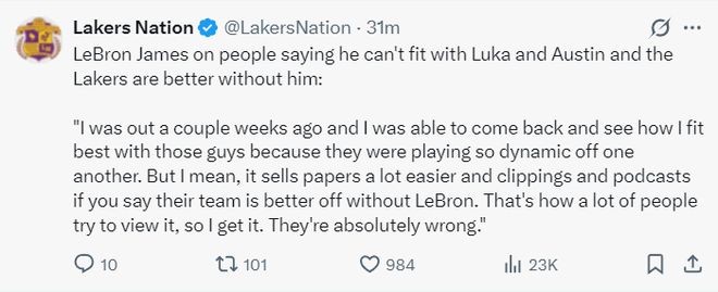 詹姆斯還回懟了那些說沒有他湖人會(huì)更好的言論!他表示:我們?nèi)说膯栴}一直是時(shí)間問題,上賽季盧卡剛好我們?cè)谀ズ?,本賽季開局我、里夫斯都缺席了一些比賽,我們都在適應(yīng)彼此,我回歸后思考了怎么融入他們。外界喜歡制造話題是為了推銷他們的報(bào)紙、播客,這些都是博眼球的方式我也能理解,但他們是完全錯(cuò)誤的。