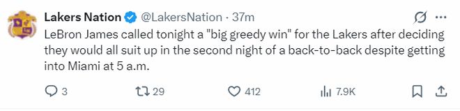 詹姆斯談到這場(chǎng)勝利直言來之不易,因?yàn)槿?duì)是凌晨5點(diǎn)從邁阿密出發(fā)的,背靠背第二場(chǎng)賽前決定全員出戰(zhàn)。
