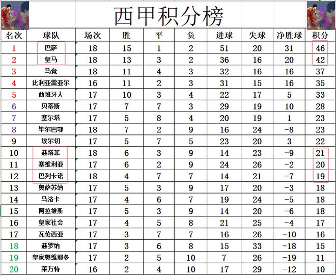 積分榜方面,皇馬最近雖然止住了頹勢,但他們還是落后巴薩4分,本輪皇馬將在主場對陣貝蒂斯,巴薩則是客場對陣西班牙人,皇馬將繼續(xù)追趕巴薩。赫塔菲今天最后時刻絕平拿到1分,多少也算是止住了3連敗,暫時超過塞維利亞1分沖進(jìn)前十上半?yún)^(qū),巴列卡諾則是暫時升至第12。