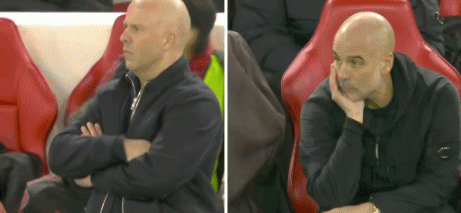 此時,鏡頭來到場邊的兩位光頭主帥,反應可謂截然不同。斯洛特揮拳轉(zhuǎn)身慶祝,瓜迪奧拉一臉無奈!