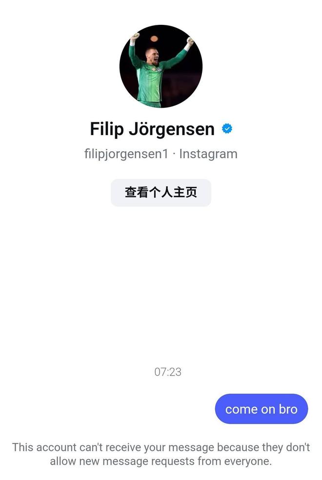 在賽后,約恩森的社交媒體賬號(hào)涌現(xiàn)了很多批評(píng)和謾罵的言論,網(wǎng)友發(fā)現(xiàn)約恩森關(guān)閉了社交媒體的私信功能,而小編也去核實(shí)了這一點(diǎn)(下圖)。
