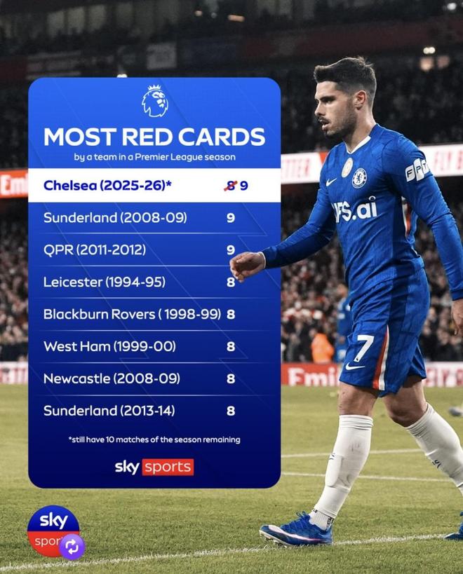 切爾西這賽季紅牌多,不像是單一球員的問題,更像是整支隊(duì)在高壓時(shí)刻的處理經(jīng)常出錯(cuò)。到3月初,切爾西28輪英超已經(jīng)吃到7張紅牌,明顯高于其他球隊(duì);更關(guān)鍵的是,這7張英超紅牌來自7個(gè)不同球員。算上各項(xiàng)賽事,切爾西本季已經(jīng)有9次被罰下,而且是9個(gè)不同的人。這個(gè)分布已經(jīng)很說明問題:不是某個(gè)人總在出事,而是全隊(duì)在比賽容易失控的階段,經(jīng)常有人做出錯(cuò)誤選擇。