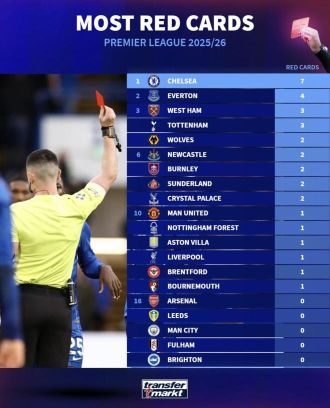 最近天空體育統(tǒng)計(jì)了英超單賽季球隊(duì)紅牌紀(jì)錄,切爾西這一季已經(jīng)被推到了最前面。內(nèi)托對(duì)阿森納被罰下之后,切爾西的單賽季紅牌數(shù)已經(jīng)追平英超歷史最高紀(jì)錄,而且賽季還沒結(jié)束,后面還有比賽要踢。再把本賽季英超紅牌榜放在一起看,切爾西也是明顯高出一檔。紅牌能多到這個(gè)地步,已經(jīng)不只是紀(jì)律差這么簡(jiǎn)單,背后到底是比賽習(xí)慣出了問題,還是這支隊(duì)在關(guān)鍵時(shí)刻總會(huì)自己把局面踢亂?(數(shù)據(jù)截至2026年3月3日)